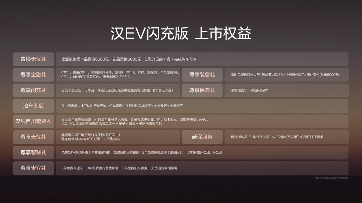 同时,比亚迪还为用户准备了置换无忧礼、1年免费闪充权益、0首付/0利息/0月供任选其一的金融礼、3年3次基础保养、包含3年免费取送车的尊享贵宾礼等共11项权益。针对追求个性的用户,官方推出价值超1.2万元的“汉纳百川”进阶生活套装,限时特惠价仅需3999元。