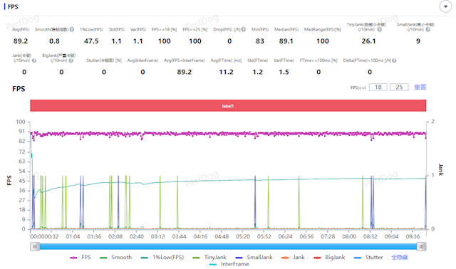 在《王者荣耀》一局5v5比赛中,可以看到帧率平均在89.2帧,波动指数0.8,实际游戏中游玩顺畅,掉帧不明显。