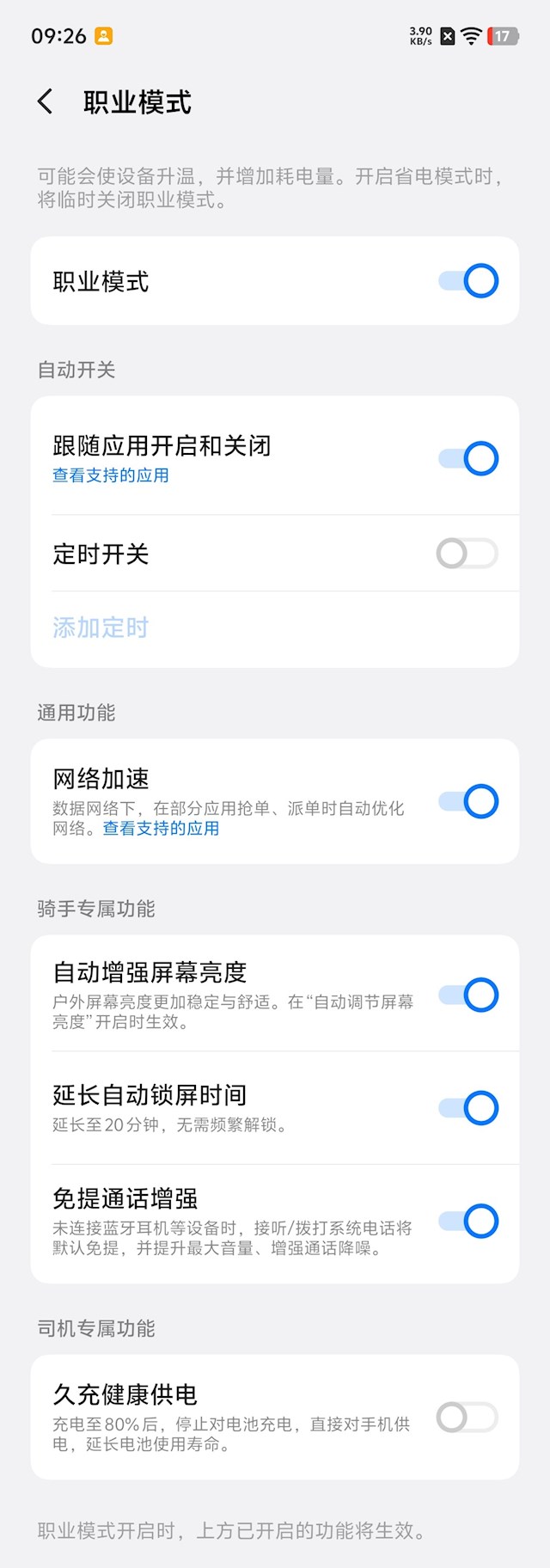 职业模式值得单拎出来夸。头盔解锁、网络加速、免提通话增强、自动延长锁屏……每一条都是给外卖骑手、网约车司机和外勤人员量身定做的,不花哨,但真有用。