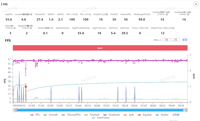 实际测试中,正式进入游戏基本稳定在60帧左右,平均帧率55.6fps,波动指数4.6,游玩也没什么问题。