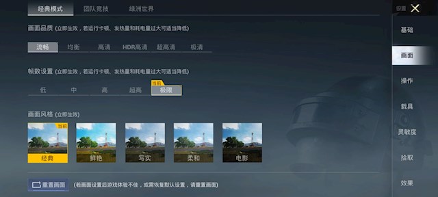 在《和平精英》中,我们打开性能模式,采用流畅画质的60帧极限,开启经典模式4人队伍进行一局游戏。