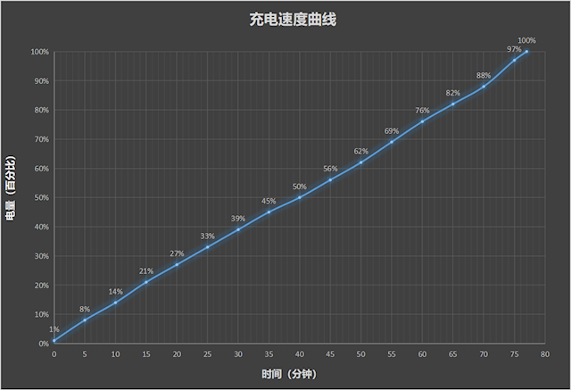 我们使用原装90W充电器,开启闪充模式,vivo Y600 Pro手机息屏,从电量1%开始充电。实际测试下来,电池10分钟可充至14%,半小时充到39%,77分钟即可充满。